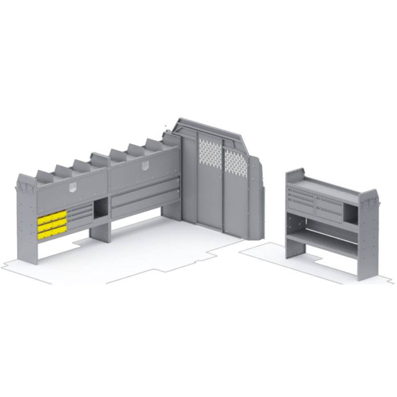 The Holman MAX Package is everything you need for a well-equipped van. Featuring two and three drawer units and bins for organizing small parts. Plus two locking shelf drawers to keep valuable tools and parts safe and secure. Includes shelf dividers and J-hooks for storing miscellaneous items. And access is easy from the driver's compartment through the locking partition door.