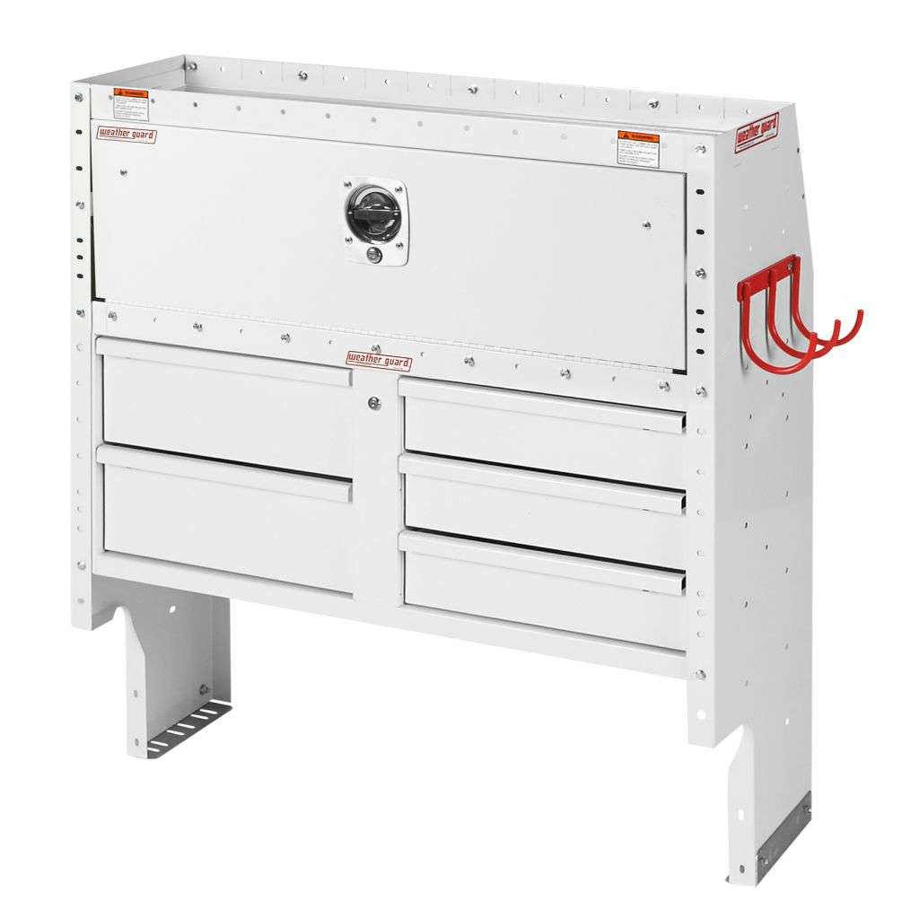 Designed for plumbers and cable/telecom installers, the Model 600-8112L van package for Full-Size, Low Roof, 148in wheel base Ford Transit vans provides adjustable cargo van shelving sized to fit the commercial van interior, a shelf door, a 5 drawer secure storage cabinet, and accessories. It includes a sturdy van bulkhead for maximum protection against shifting loads. Additional van products are available to create a custom van storage solution.