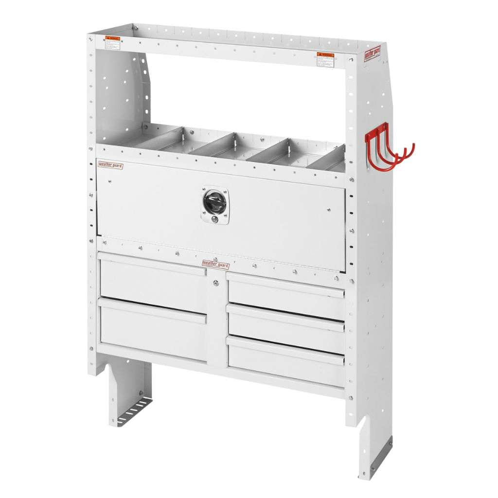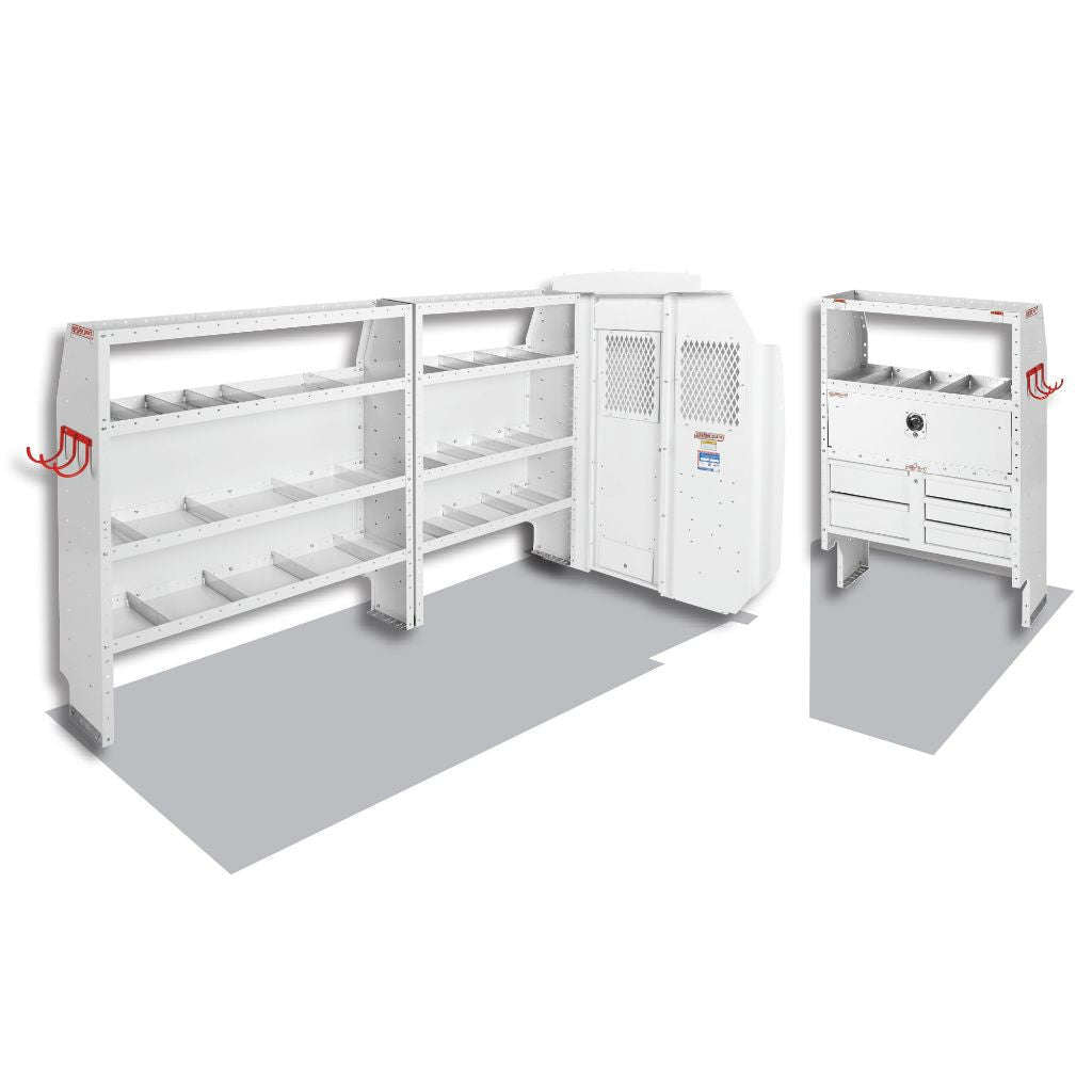 Designed for plumbers and cable/telecom installers, the Model 600-8212R van package for Mid-Roof, 130in wheel base Ford Transit vans provides adjustable cargo van shelving sized to fit the commercial van interior, a shelf door, a 5 drawer secure storage cabinet, and accessories. It includes a sturdy van bulkhead for maximum protection against shifting loads. Additional van products are available to create a custom van storage solution.