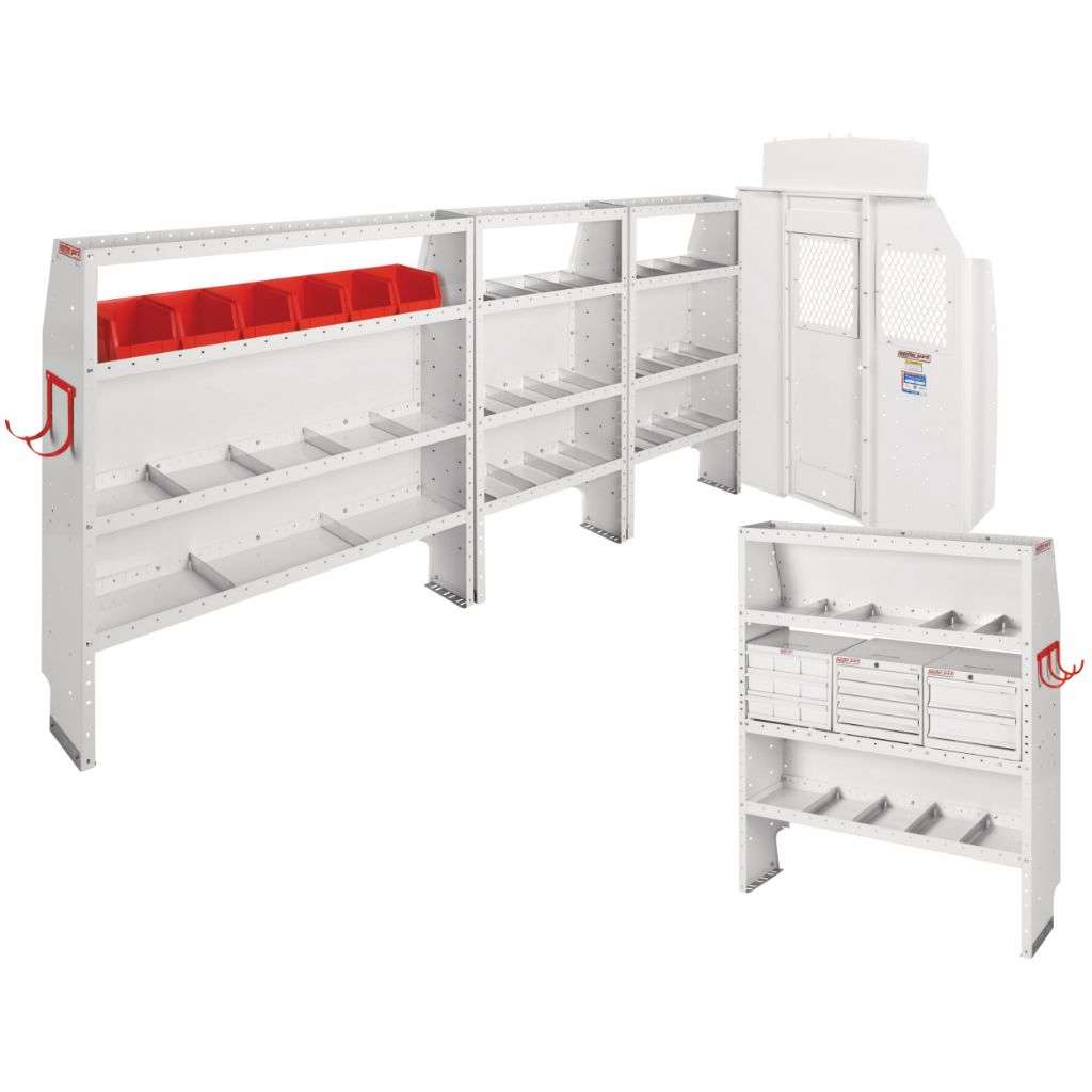 - Includes 60in high adjustable cargo van shelving and a mesh van bulkhead with swinging door kit