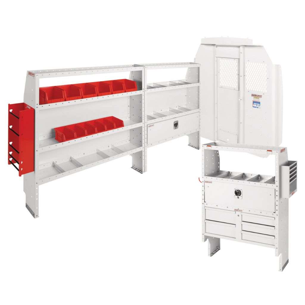 - Includes 60in high adjustable cargo van shelving and a mesh van bulkhead with swinging door kit