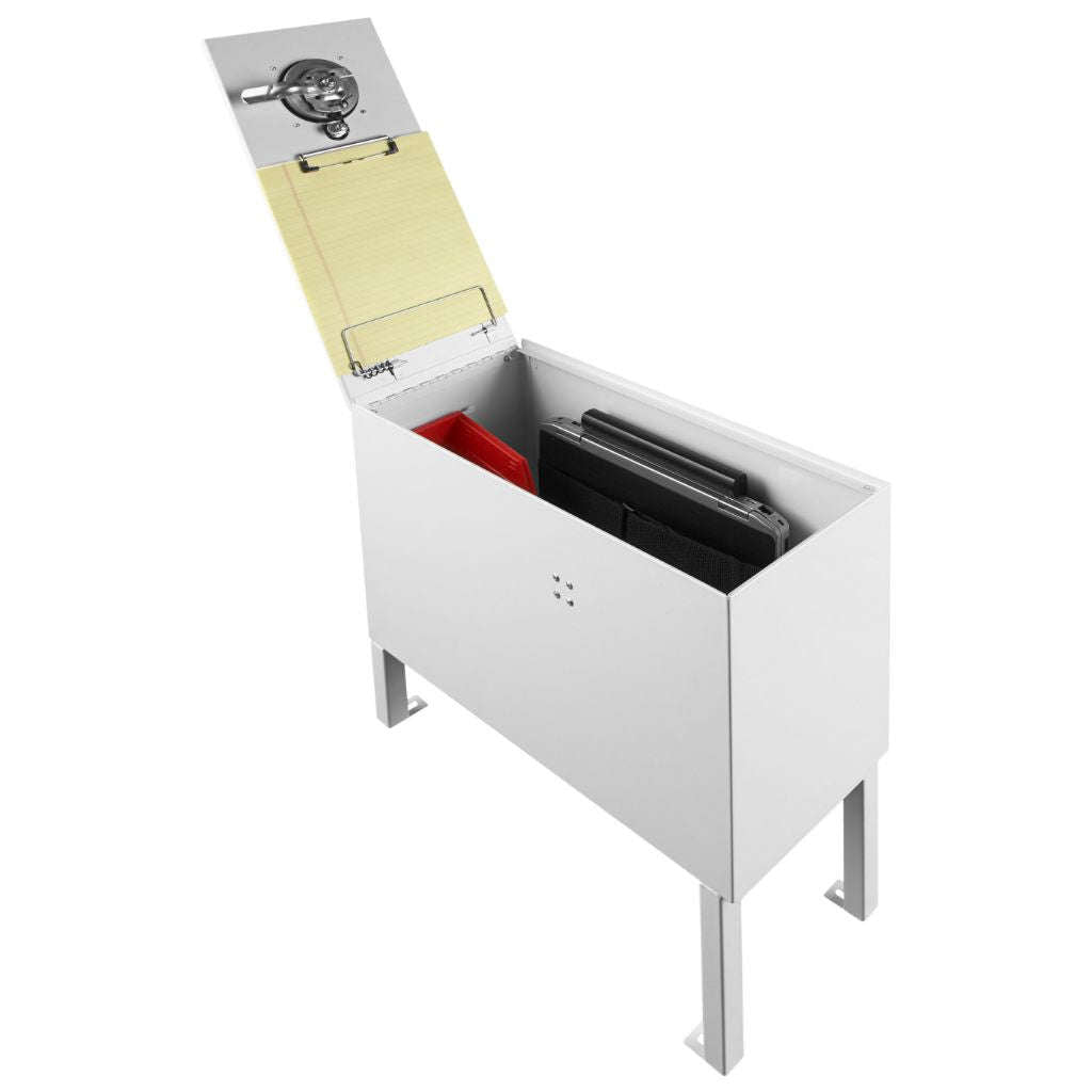 - Between-seat van storage cabinet with room for your laptop and hanging files